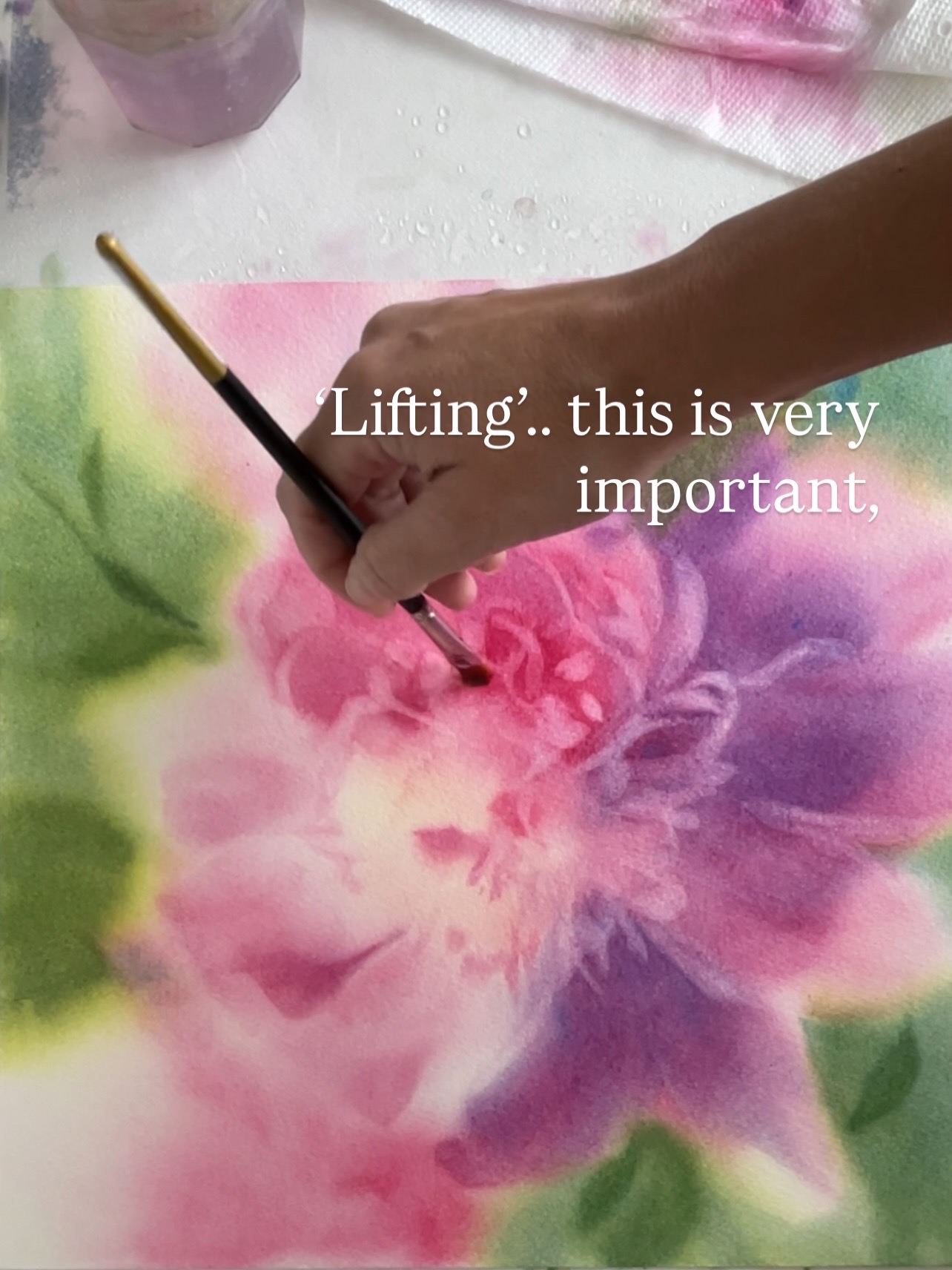 While the paper is still damp, I can begin 'lifting highlights' petals, and edges using a smaller stiffer brush. I like synthetic brushes at this stage because they are more firm and come to a sharper edge. They can lift without adding extra water to the paper. However, if I want to lift a larger area, I will use a natural brush or something that can soak up more paint/water. I'm using a variety of brushes including several Blick angled watercolor brushes and Princeton angled and flat brushes. If the edges of the painting begin to dry, I just lightly mist with a fine mist spray bottle.